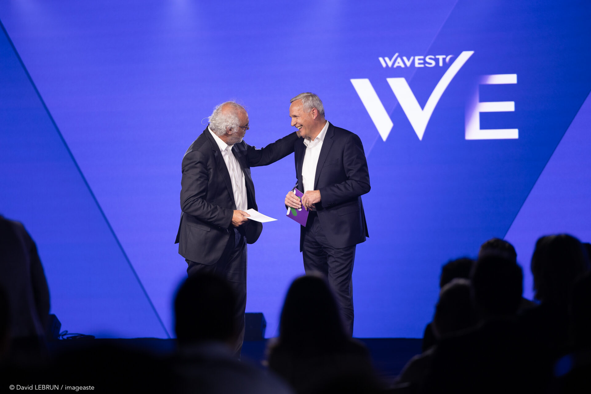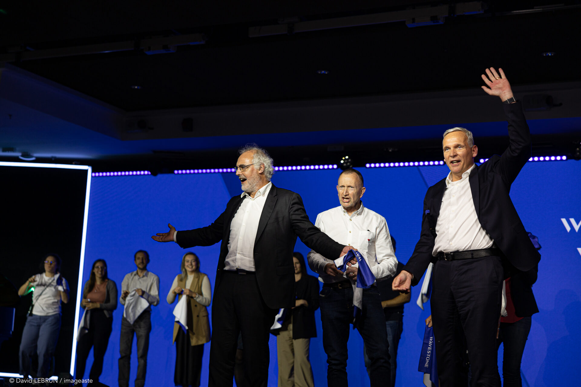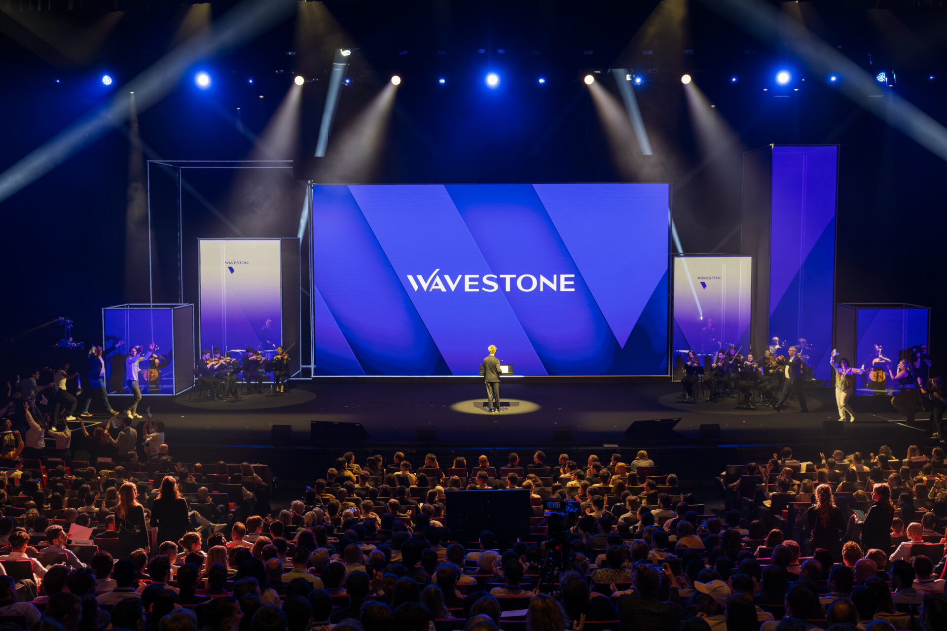La Lune Rousse a rencontré Wavestone en 2014. Depuis 10 ans, l’agence accompagne le groupe dans son incroyable parcours, passant de 1200 à près de 6000 collaborateurs que l’agence a, à chaque événement, rassemblés pour leur permettre de vivre ensemble un moment unique et inoubliable. Que ce soit au Grand Rex pour accompagner la naissance du nouveau groupe et son nouveau nom (Wavestone), au Grand Palais avec 3500 collaborateurs pour enfin célébrer la fusion avec Q_Perior au Palais des Congrès devant 5500 personnes, la Lune Rousse a déployé ce qu’elle sait faire de mieux : des formats sensibles en compagnie d’artistes qui ont écrit des pages originales pour faire de ces moments des sources inépuisables de la mémoire collective.